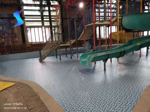本項(xiàng)目位于北京市,為室內(nèi)水上樂園項(xiàng)目,原基礎(chǔ)為馬賽克瓷磚,局部有脫落、開裂問題,采用1.5mm泳池膠膜施工安裝,采用滿刮膠工藝熱熔焊接。施工安裝之前瓷磚損壞部分做找平處理,泳池膠膜施工安裝完畢后,整體比較平整、美觀。現(xiàn)場(chǎng)效果如下: