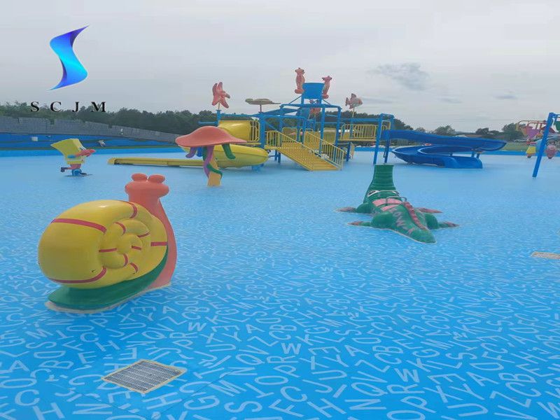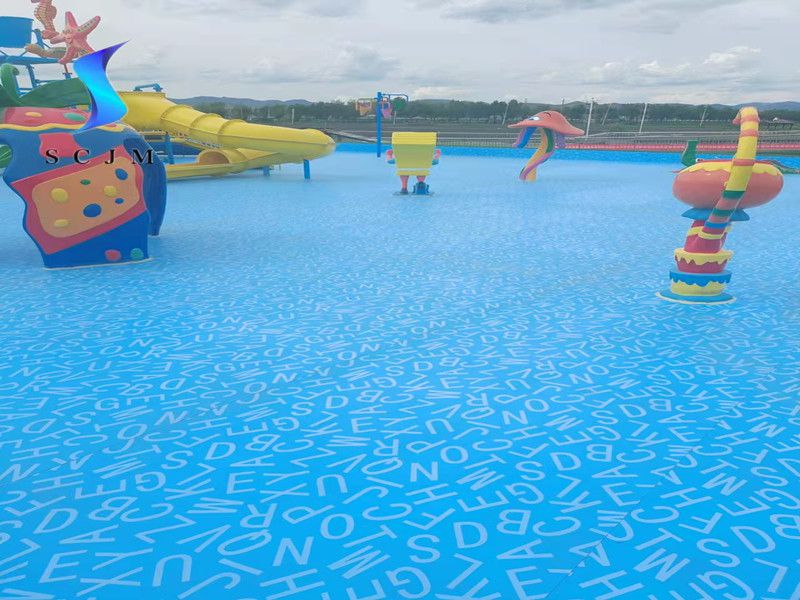 本項目位于內蒙古自治區,為室外戲水池項目,也就是水上樂園項目,基礎面為水泥收光面,采用滿刮膠搭邊熱熔焊接工藝,選擇1.5mm字母圖案游泳池防水膠膜為材料,進行鋪設安裝,整體效果如下: