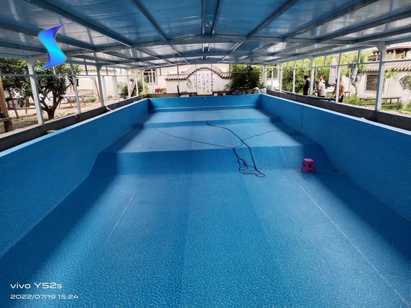 本項目位于河北邯鄲市,原基礎為馬賽克瓷磚,由于馬賽克瓷磚出現脫落問題,所以采用泳池膠膜更換改造,選擇1.5mm水波紋泳池膠膜,滿刮膠搭邊熱熔焊接工藝,整體效果如下: